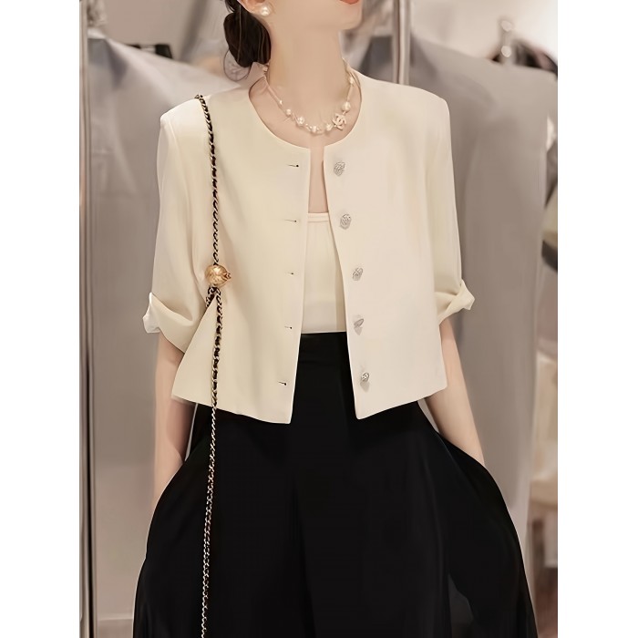 Elegant Women's Solid Half Sleeve Blazer - Stylish Crew Neck Button Front Outerwear